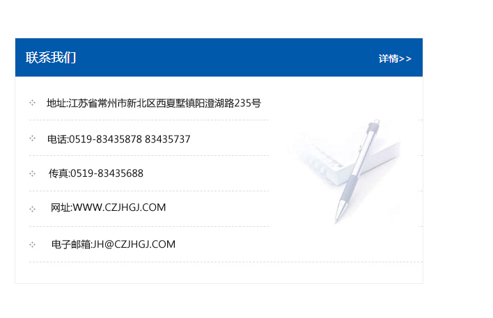 地址:常州市新北區友邦商務大廈1幢16、17層  電話:0519-85101652  傳真:0519-85112595  郵編:213022  網址:www.cz-jiayue_cn.wxfluid.com  郵箱:xiajifengaa@163.com